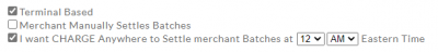 Time Initiated - Merchant Initiated: Settlement managed by Charge Anywhere, this is supported for processing platforms such as TSYS and Elavon. Merchant Manually Settles batches: the batch will stay open until the merchant closes the batch manually I want Charge Anywhere to Settle merchant Batches at 12AM EST. Charge Anywhere will send transaction totals to host for settlement every day at 12 AM unless ISO enters a different time.