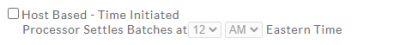 Host Based - Time Initiated: Settlement managed by Host (First Data Rapid Connect, Global Payments, Chase Paymentech,..) at a time set by the channel at the host. Time provided under Settlement Options is the time when a report is created by Charge Anywhere, that report has Success* in it as the result. Per default config the report will be generated every day at 12AM EST unless ISO enters a different time.